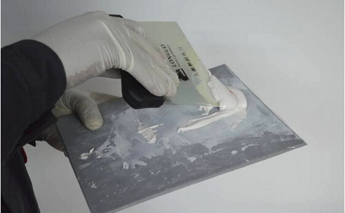 用原子灰刮刀取少量填眼灰置于原子灰托板上,也可以置于另一把刮刀片上。由于填眼灰一般不需要添加固化劑,取出后即可使用(有的填眼灰需按比例加入稀釋劑混合后才能使用),而且其固化時(shí)間很短,用量也少,所以應(yīng)少取,并且應(yīng)在盡量短的時(shí)間內(nèi)用完。