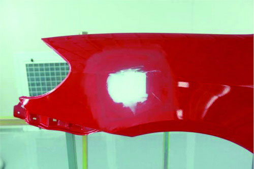 ②指刮法。在原子灰干燥過程中,可以用手指甲輕輕地刮原子灰邊緣薄的部分,檢查原子灰是否已經(jīng)干透。如果沒有干透,則在指甲上會(huì)粘有原子灰;如果已經(jīng)干透,則指甲不會(huì)粘上原子灰,并在原子灰上出現(xiàn)堅(jiān)硬的白色痕跡。如圖2-53所示。