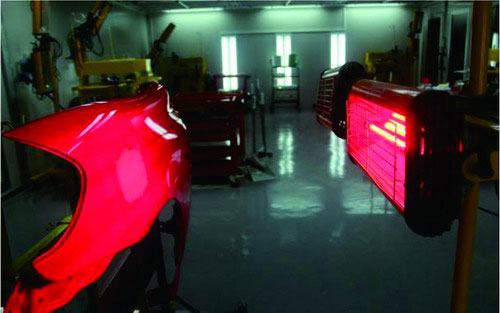 ②紅外線干燥。如果環(huán)境溫度太低或者空氣濕度太大,原子灰干燥固化速度就會(huì)減慢。為了縮短原子灰的干燥時(shí)間,可以借用干燥器或者是紅外線烤燈加熱原子灰進(jìn)行干燥。一般烘烤時(shí)間設(shè)定為10min左右,在烘烤過程中,要不斷檢測(cè)板件的溫度,并檢查原子灰是否已經(jīng)干燥。如圖2-51所示。