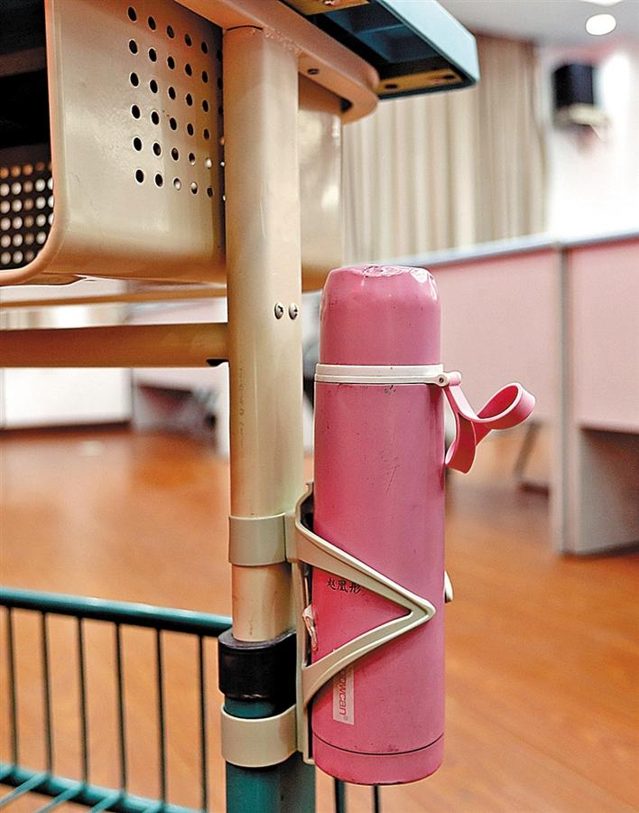 ▲課桌一側(cè)設(shè)有存放水壺的裝置。