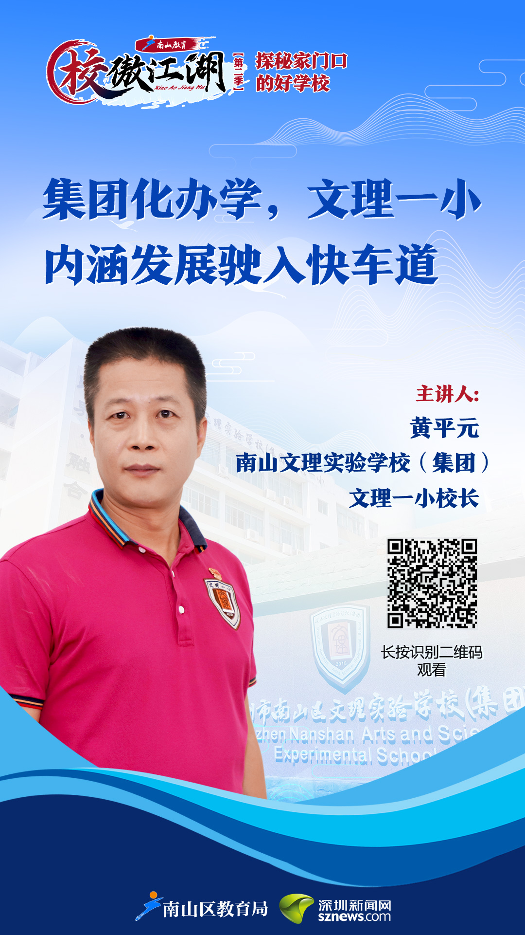 《校傲江湖》第二季——探秘家門口的好學(xué)校,帶著大家與校長面對(duì)面,探索南山各所優(yōu)質(zhì)學(xué)校,了解它們的辦學(xué)特色,領(lǐng)略它們的魅力!在上一期節(jié)目中,校傲江湖探訪了南山區(qū)文理學(xué)校(集團(tuán))科創(chuàng)學(xué)校,南山區(qū)文理學(xué)校(集團(tuán))總校長兼科創(chuàng)學(xué)校校長吳希福為大家詳細(xì)介紹了科創(chuàng)學(xué)校的教育理念。本期節(jié)目來到南山文理實(shí)驗(yàn)學(xué)校(集團(tuán))文理一小,文理一小校長黃平元面對(duì)面介紹集團(tuán)化辦學(xué)后,文理一小內(nèi)涵發(fā)展駛?cè)肟燔嚨赖娜媲闆r。