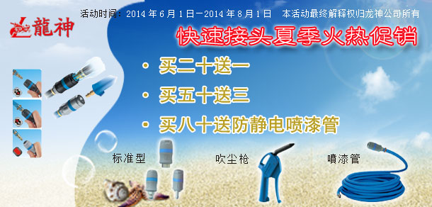 2014年6月法國(guó)佩釜標(biāo)準(zhǔn)快速接頭“爽一夏”讓利大促銷 2014-05-30 43186 1、買(mǎi)二十送一(即買(mǎi)二十個(gè)快速接頭送一個(gè)法國(guó)佩釜快速接頭或法國(guó)佩釜吹塵槍(編號(hào):38016)一把) 2、買(mǎi)五十送三(即買(mǎi)五十個(gè)快速接頭送三個(gè)法國(guó)佩釜快速接頭或法法國(guó)佩釜吹塵槍(編號(hào):38016)三把) 3、買(mǎi)八十送一卷防靜電噴漆軟管(編號(hào):36323)