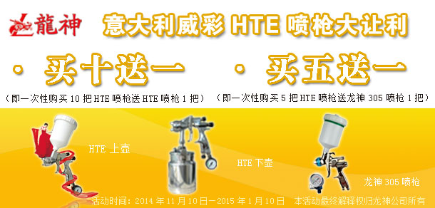 2014年11月吉尼斯HTE噴槍"初冬.讓利"大促銷 2014-11-11 16521 活動(dòng)內(nèi)容: 1、買(mǎi)十送一(即一次購(gòu)買(mǎi)十把HTE噴槍送一把HTE噴槍) 2、買(mǎi)五送一(即一次購(gòu)買(mǎi)五把HTE噴槍送一把龍神305噴槍) 活動(dòng)期間HTE上下壺噴槍的贈(zèng)送方式為:以多贈(zèng)送原則(如:買(mǎi)6把上壺+4把下壺,贈(zèng)送上壺。反之亦然,以此類推。)