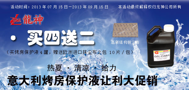 "熱夏 清涼 給力" 意大利烤房保護(hù)液讓利大促銷! 2013-07-16 25191 "熱夏 清涼 給力" 意大利烤房保護(hù)液讓利大促銷!活動(dòng)時(shí)間:2013年07月15日至2013年09月15日。 時(shí)長(zhǎng):共計(jì)2個(gè)月