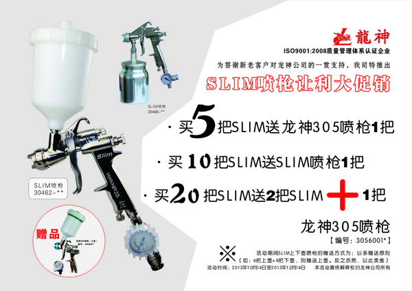 2013年10月至12月SLIM噴槍促銷方案 2013-10-12 11479 SLIM噴槍讓利大促銷,起始時(shí)間:2013年10月14日至2013年12月14日,時(shí)長(zhǎng):二個(gè)月。
