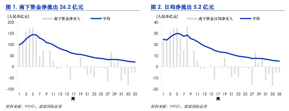 南下資金連續(xù)5周維持凈流出狀態(tài),凈流出量26.2 億元,環(huán)比增加 0.5 億元。買入賣出均維持低量,顯示南下資金情緒仍然較為謹(jǐn)慎。而上周人民幣兌港元反彈0.3%,不利于資金南下復(fù)蘇。