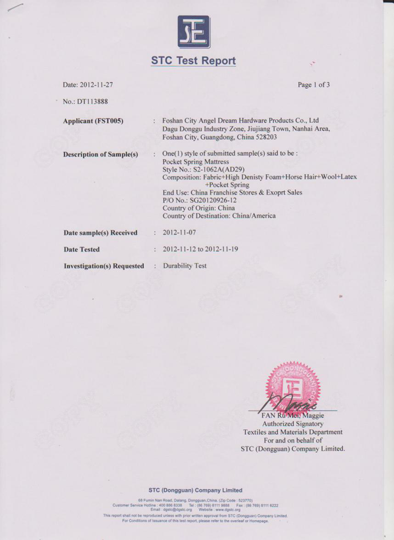 雙重?zé)崽幚砥鸬揭粋€全面消除了彈簧的內(nèi)應(yīng)力,增加抗疲勞強度,提高了彈性極限,使彈簧的彈性、拉力和回彈力更好,床芯不易凹塌變形,彈簧不易折斷。經(jīng)權(quán)威檢測機(jī)構(gòu)STC測試證明:嚴(yán)格按照美標(biāo)ASTM1566耐疲勞測試,西婭圖品牌床墊達(dá)到10萬次連續(xù)錘壓不變形。(吳艷 通訊員/阿東)
